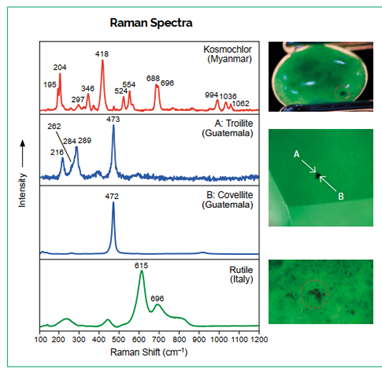 Độ đều màu và việc chứa ít bao thể là các tiêu chí lựa chọn mẫu, do đó không ngạc nhiên khi phần lớn các mẫu từ Myanmar và Guatemala cho thấy sự thiếu vắng đáng kể bao thể khi quan sát dưới độ phóng đại 10× với ánh sáng truyền qua hoặc phản xạ. Một mẫu jadeit từ Myanmar (BU-03) và một mẫu từ Guatemala (GU-02) chứa các bao thể rắn màu đen. Phân tích phổ Raman cho thấy các bao thể màu đen trong mẫu Myanmar là khoáng vật kosmochlor (Hình 6, trên), vốn thường gặp trong ngọc jade từ khu vực này (GAHK 2016) nhưng chưa từng được ghi nhận trong các nghiên cứu trước đây đối với vật liệu từ Guatemala. Các bao thể đen trong mẫu từ Guatemala được xác định là các khoáng sulfide gồm covellit (CuS) và troilit (FeS; Hình 6, giữa). Sự hiện diện đáng kể các khoáng sulfide có thể là chỉ thị nguồn gốc từ Guatemala, do chúng tương đối hiếm gặp trong vật liệu từ Myanmar (Ou Yang et al. 2003; Shi et al. 2009; Franz et al. 2014; Liu et al. 2015) cũng như từ Ý (Adamo et al. 2006).