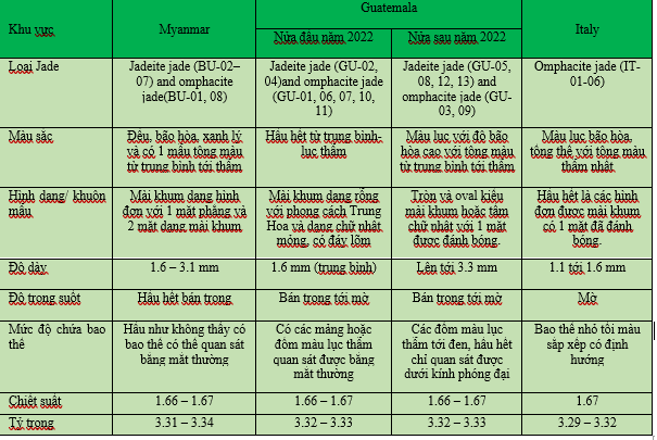 Các đặc điểm cơ bản của các mẫu nghiên cứu được tóm tắt trong Bảng I. Các mẫu có nguồn gốc từ Myanmar có màu xanh lý cùng độ thấu quang rất tốt, hầu như không quan sát thấy bao thể bằng mắt thường. Các mẫu từ Guatemala cho thấy sự biến thiên đáng kể về hình dạng và kiểu cắt. Những mẫu thu thập trong khoảng nửa đầu năm 2022 có màu xanh lục từ trung bình đến thẫm, chủ yếu được chế tác dưới dạng mài khum rỗng và các phiến chữ nhật mỏng với đáy lõm. Với kiểu chế tác này, cùng với độ dày trung bình chỉ khoảng 1,6 mm, góp phần làm giảm độ đậm của màu nền và cải thiện độ trong suốt. Đôi khi có thể quan sát thấy các mảng hoặc đốm xanh lục thẫm bằng mắt thường. Các mẫu thu thập từ Guatemala trong khoảng nửa sau năm 2022 thể hiện màu xanh lục có độ bão hòa cao, được đánh bóng dưới dạng hình tròn, oval, kiểu mài khum hoặc các phiến chữ nhật với đáy phẳng được đánh bóng. Các bao thể, như những đốm màu lục thẫm đến đen, khó quan sát nếu không được phóng đại lên nhiều lần. Các mẫu từ Ý có màu xanh lục bão hòa, nhìn chung có tông màu thẫm nhất trong số các mẫu nghiên cứu. Phần lớn được chế tác dạng mài khum với đáy phẳng đánh bóng. Chúng có độ trong suốt ở mức mờ và chứa các bao thể màu đen kích thước vi mô có định hướng, biểu hiện màu nâu phớt đỏ đến nâu thẫm dưới ánh sáng phản xạ có cường độ mạnh.