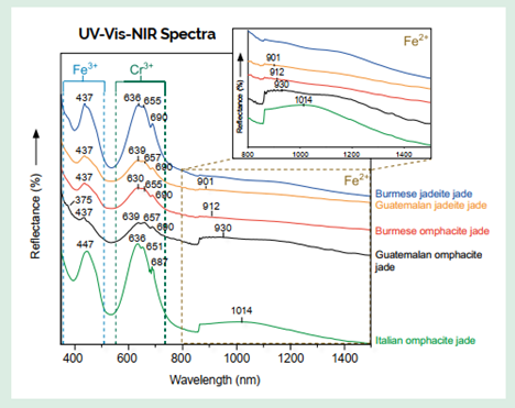 Phổ UV-Vis-NIR cũng có thể được sử dụng để xác định khoáng vật chiếm ưu thế trong mẫu (tức jadeit hoặc omphacit) dựa trên cường độ hấp thụ của Fe²⁺ và Fe³⁺. Ion Fe³⁺ gây ra các đỉnh hấp thụ tại 380 và 437 nm, với cường độ mạnh hơn trong ngọc jadeit so với ngọc omphacit (Burns 1993; Shinno & Oba 1993; Coccato et al. 2014; Kan-Nyunt et al. 2014). Tất cả các mẫu của chúng tôi từ Myanmar và Guatemala đều thể hiện một đỉnh rõ rệt quanh 437 nm cho thấy sự hiện diện của jadeit-trong khi đỉnh Fe³⁺ còn lại tại 380 nm bị che khuất bởi vùng hấp thụ mạnh trong khoảng 360–390 nm. Đối với các mẫu từ Ý, đỉnh Fe³⁺ tại 437 nm dịch chuyển về phía bước sóng cao hơn, đạt 447 nm.