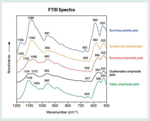 Phổ hồng ngoại biến đổi Fourier (FTIR). Bản chất không đồng nhất, kích thước hạt mịn và đặc tính đa tinh thể của ngọc jadeit–omphacit đặt ra những thách thức đáng kể trong việc xác định một cách toàn diện thành phần khoáng vật (Lu 2011; Franz và cs. 2014; Khourie 2023). Các kỹ thuật phổ, đặc biệt là FTIR và Raman, trước đây đã được ứng dụng để phân loại chủng loại ngọc (tức jadeit hay omphacit) dựa trên khoáng vật chiếm ưu thế (Franz và cs. 2014; GAHK 2016). Trong các tiêu chuẩn phòng thí nghiệm tại Hồng Kông, Trung Quốc và Thái Lan (GAHK 2016; NSPRC 2017; GIT 2022), phổ FTIR là phép thử thường được sử dụng để xác định loại ngọc và các xử lý, thường được tiến hành ở chế độ phản xạ (Ou Yang và cs. 2003; Liu & Peng 2010; Fan và cs. 2014; Franz và cs. 2014; GAHK 2016; Zhang & Shi 2022). Việc gán các đỉnh phổ FTIR được đề cập dưới đây dựa trên các nghiên cứu của Ou Yang và cộng sự (2003) và Zhang & Shi (2022).