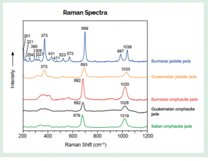 Kết quả phổ Raman của chúng tôi phù hợp với dữ liệu FTIR và UV-Vis-NIR về cả loại ngọc và nguồn gốc địa lý. Tất cả các mẫu từ Ý đều bị chi phối bởi omphacit giàu Cr, với dải đặc trưng tại 679–680 cm⁻¹. Phần lớn các mẫu từ Myanmar là jadeit chiếm ưu thế, tuy nhiên có hai mẫu bị chi phối bởi omphacit. Các đỉnh phổ Raman của toàn bộ mẫu từ Myanmar phù hợp với các nghiên cứu trước đây về jadeit và omphacit Myanmar với dải màu sắc và độ trong suốt đa dạng (Ou Yang và cs. 2003; Liu và cs. 2011, 2015; Fan và cs. 2014; Franz và cs. 2014; Zhang & Shi 2022).