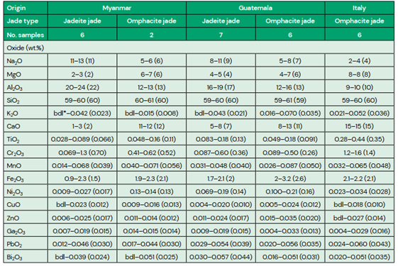Phổ FTIR của các mẫu thu thập từ Ý phù hợp với các công bố trước đây, trong đó vật liệu từ khu vực này được xác định là ngọc omphacit (Adamo và cộng sự, 2006). Các mẫu này thể hiện đặc trưng tỷ số cường độ đạt khoảng 1.3–1.5:1 đối với các dải hấp thụ nêu trên, khác biệt so với tỷ số phổ biến 0.8–1.0:1 quan sát được trong các mẫu omphacit từ Guatemala và Myanmar. Dữ liệu EDXRF và LA-ICP-MS của chúng tôi cho thấy sự hiện diện của hàm lượng Cr cao hơn (xem phần dưới), đây có thể là nguyên nhân dẫn đến sự sai khác này, tương tự như đã ghi nhận trong omphacit chứa Mn có nguồn gốc từ Ý (Diella và cs. 2021).