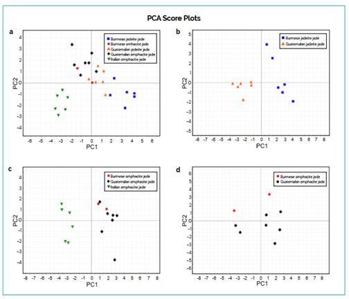 (a) Khi xét toàn bộ các mẫu trong nghiên cứu này, ngọc omphacit từ Ý được phân tách rõ ràng, trong khi các mẫu ngọc từ Myanmar và Guatemala không thể hiện sự phân tách rõ rệt.