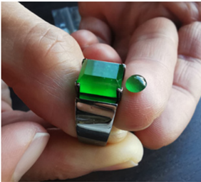 Hình 1: Một chiếc nhẫn chứa viên jade hoàng gia từ Myanma (sản phẩm của Stanley Chu) đang đặt cạnh một viên chế tác kiểu mài khum đến từ Guatemala, được sử dụng trong nghiên cứu này. Ảnh: S. I Liu.