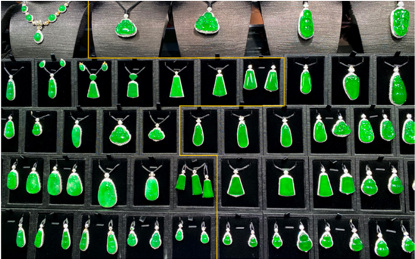 Hình 2: Trang sức ngọc jadeit-omphacit màu lục chất lượng cao được trưng bày tại chợ ngọc Sihui, tỉnh Quảng Đông, Trung Quốc. Các sản phẩm bên trái đường kẻ màu vàng đến từ Myanma, các sản phẩm bên phải có nguồn gốc từ Guatemala. Kích thước của chúng dao động từ 6,3 × 10,2 mm đến 15,2 × 25,3 mm. Ảnh: K. Y. Man.