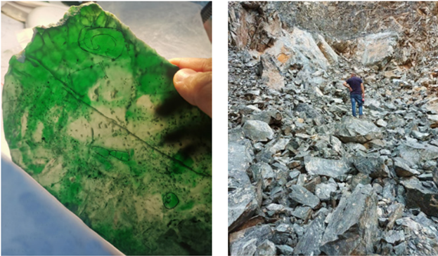 Hình 3 (trái): Một phiến jade từ Guatemala (154,9 × 98,4 × 3,2 mm) với các vị trí được đánh dấu để chế tác thành các mẫu màu lục chất lượng cao, có hàm lượng tạp chất thấp. Ảnh: S. I Liu. Hình 4 (phải): Một khu vực khai thác mới ở Morales, tỉnh Izabal, Guatemala, đã là nguồn ngọc jadeit-omphacit màu lục chất lượng cao từ năm 2022. Ảnh: Luis Carlos Solórzano cung cấp.