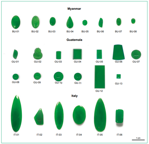 Gồm hơn 220 mẫu, với 27 mẫu jade màu lục chất lượng cao từ Myanma (trước đây là Miến Điện; số mẫu bắt đầu bằng BU, n = 8), Guatemala (GU, n = 13) và Ý (IT, n = 6) đã được chọn để phân tích cho nghiên cứu này (Hình 5). Chúng được chế tác theo nhiều kiểu khác nhau, bao gồm kiểu mài khum, kiểu tấm và kiểu chạm khắc Trung Quốc. Trọng lượng các mẫu dao động từ 0,32 đến 4,12 ct. Các mẫu từ Myanma và Guatemala được mua từ các nhà kinh doanh và nhà sản xuất Trung Quốc đáng tin cậy, những người trực tiếp nhập khẩu nguyên liệu thô từ chủ mỏ, và các mẫu của Ý được thu thập từ một chủ mỏ khai thác jade ở Ý. Tiêu chí lựa chọn mẫu bao gồm cả màu sắc (tức là màu xanh lục đồng đều, độ bão hòa cao với tông màu từ trung bình đến đậm) và độ trong suốt (mờ đến bán trong với ít tạp chất lỏng/rắn hoặc khoáng vật phụ có thể quan sát thấy). Ngoài ra, các quy trình kiểm tra tiêu chuẩn (GAHK 2016; NSPRC 2017; GIT 2022) đã được sử dụng để xác nhận rằng tất cả các mẫu đều là dạng tập hợp của jadeit và/hoặc omphacit.
